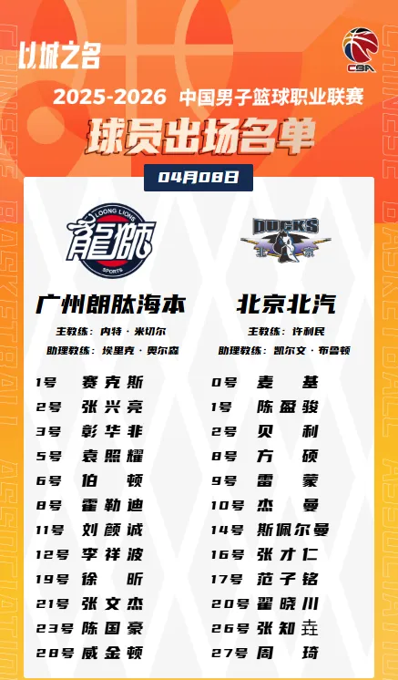 虎扑04月08日讯 今晚CBA常规赛,北京对阵广州的大名单已经公布。